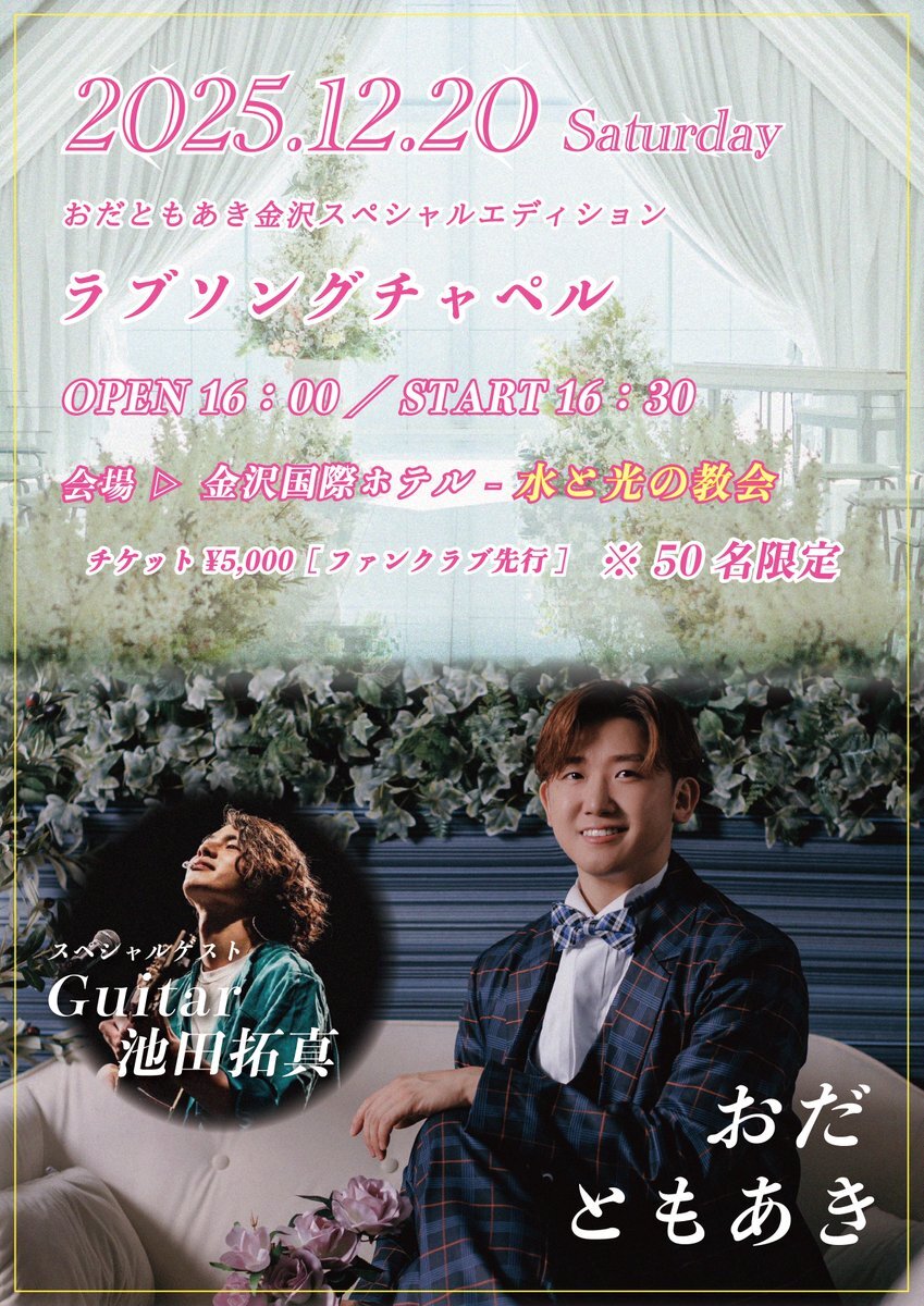 \金沢にて教会ライブ⛪️/ 2025.12.20(土) 「 ラブソングチャペル 」 本日21時より一般チケットの 販売が開始となります🎫 21時になりましたら ホームページのスケジュール 合わせてXに チケットURLを投稿します🙇 どうぞよろしくお願いします◎ #おだともあき #池田拓真 pic.x.com/qgEZ82f8z4 x.com/odtmak/status/…